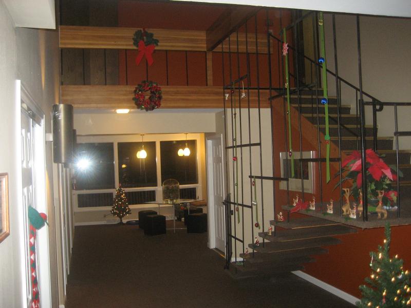 entrance hall opening onto the family room, with the stairway to