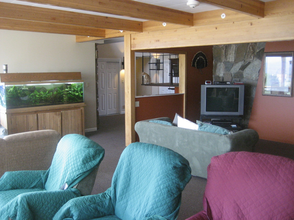 of our feline assistants and the living room aquarium.
