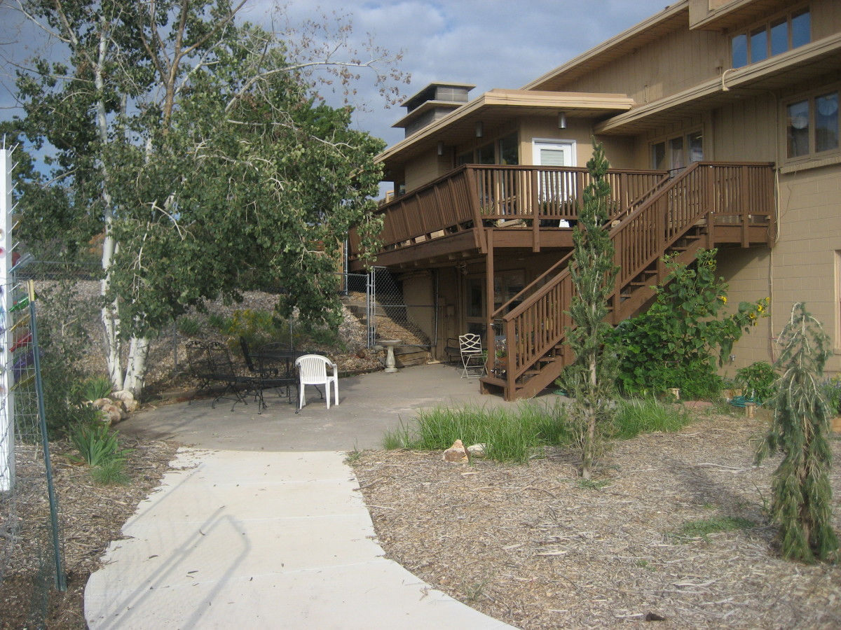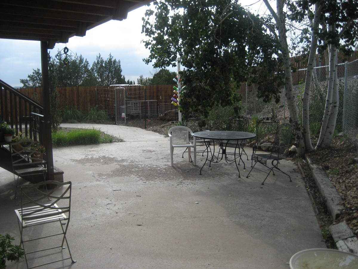 patio/garden area shaded by a group of aspen trees.